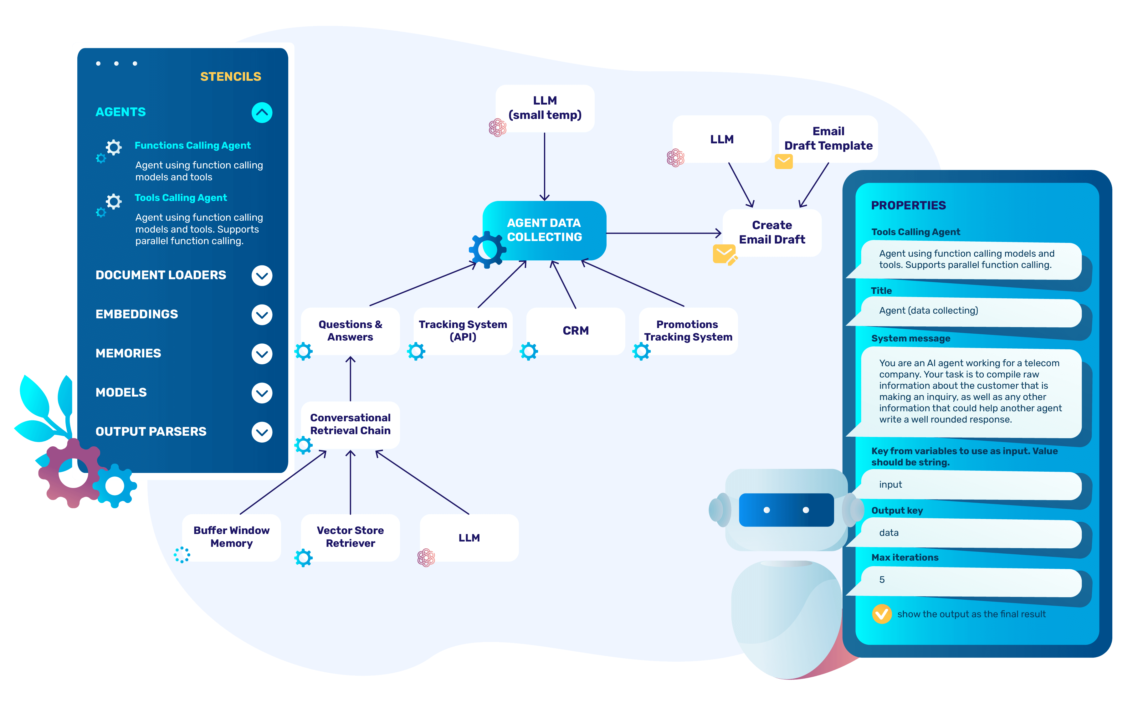 And now imagine that you can achieve this by drawing the elements of the chain (agents and tools) and their relationships, using human language instead of programming language to describe the functionality of each agent and tool (when to activate a tool and how to use it).